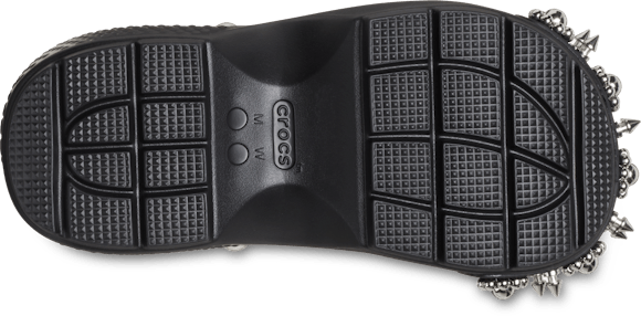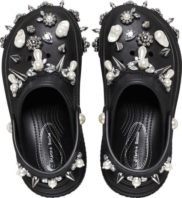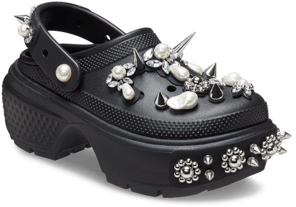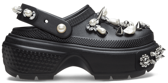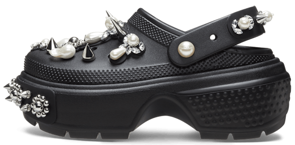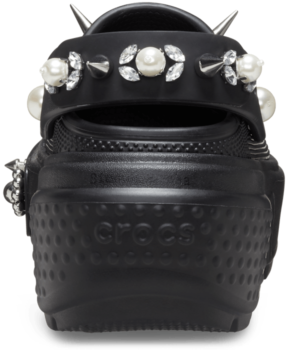 High fashion, new heights with the platform Simone Rocha x Crocs Stomp Clog. Shining spikes and crystals wrap the front edge of the lug-sole and ankle strap, punctuated with a pearl rivet. An exclusive collection of Jibbitz™ charms adorn the clog’s upper for style that’s both elegant and punk rock.